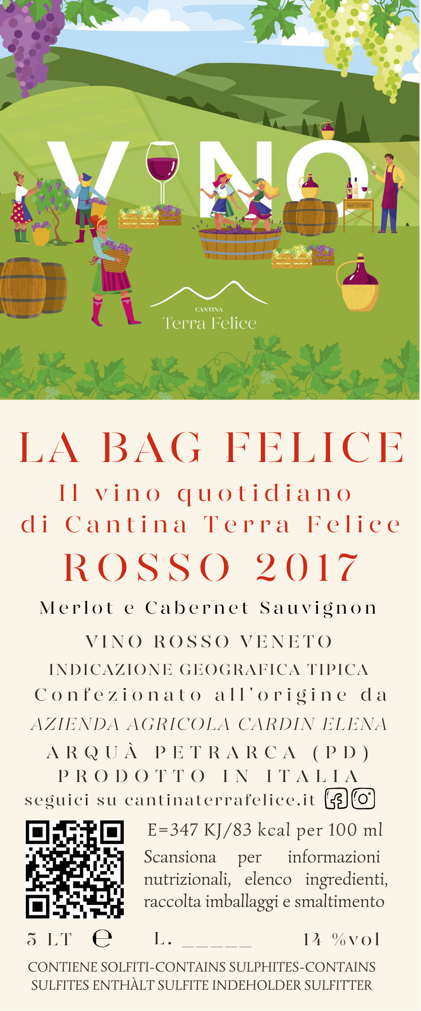 Nella nostra Bag Felice troverete un taglio bordolese di Merlot e Cabernet, un rosso che prima di esservi immesso ha trascorso 10 mesi in tonneaux. L’abbiamo testato molto a lungo e la durata reale della Bag, una volta aperta, supera con tranquillità i 3 mesi.